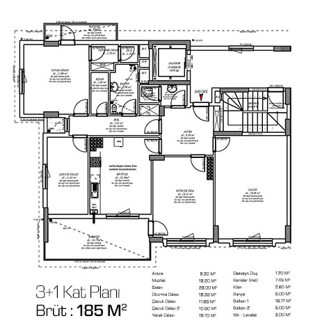 | Daireler | 3+1 : Brüt 185 M2 |