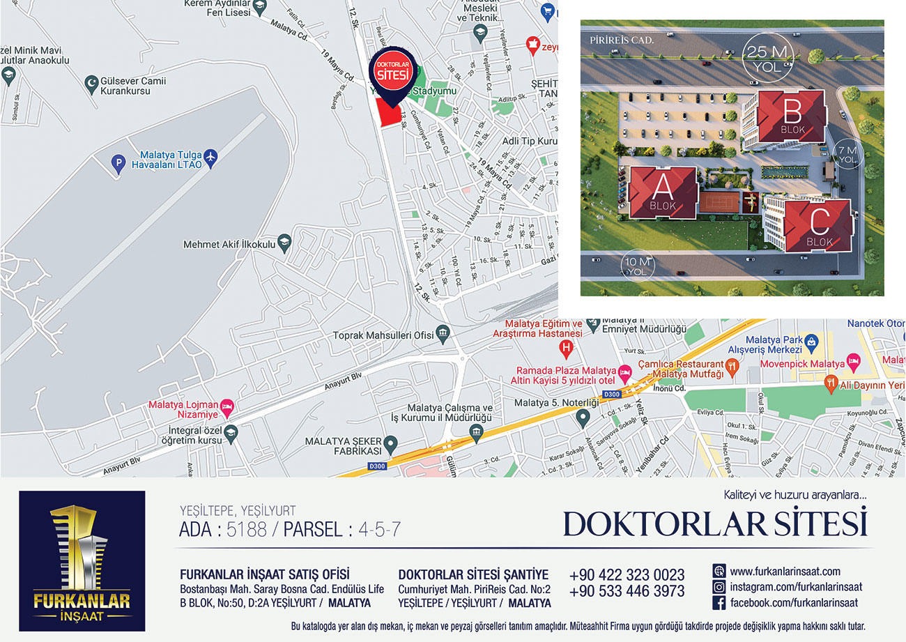 Projemiz; Malatya’da değişim ve kentsel dönüşüm projeleri ile çehresi değişen Yeşiltepe bölgesinde inşa edilmektedir. Ergenekon Geçidi - Yeşiltepe yolu üzerinde 25 metrelik ana arter caddeye cephedir. Bu nedenle Malatya Eğitim ve Araştırma Hastanesi’ne ve şehir merkezine ulaşım kolaydır. Projemiz 8.900 M2 alan üzerine kuruludur.